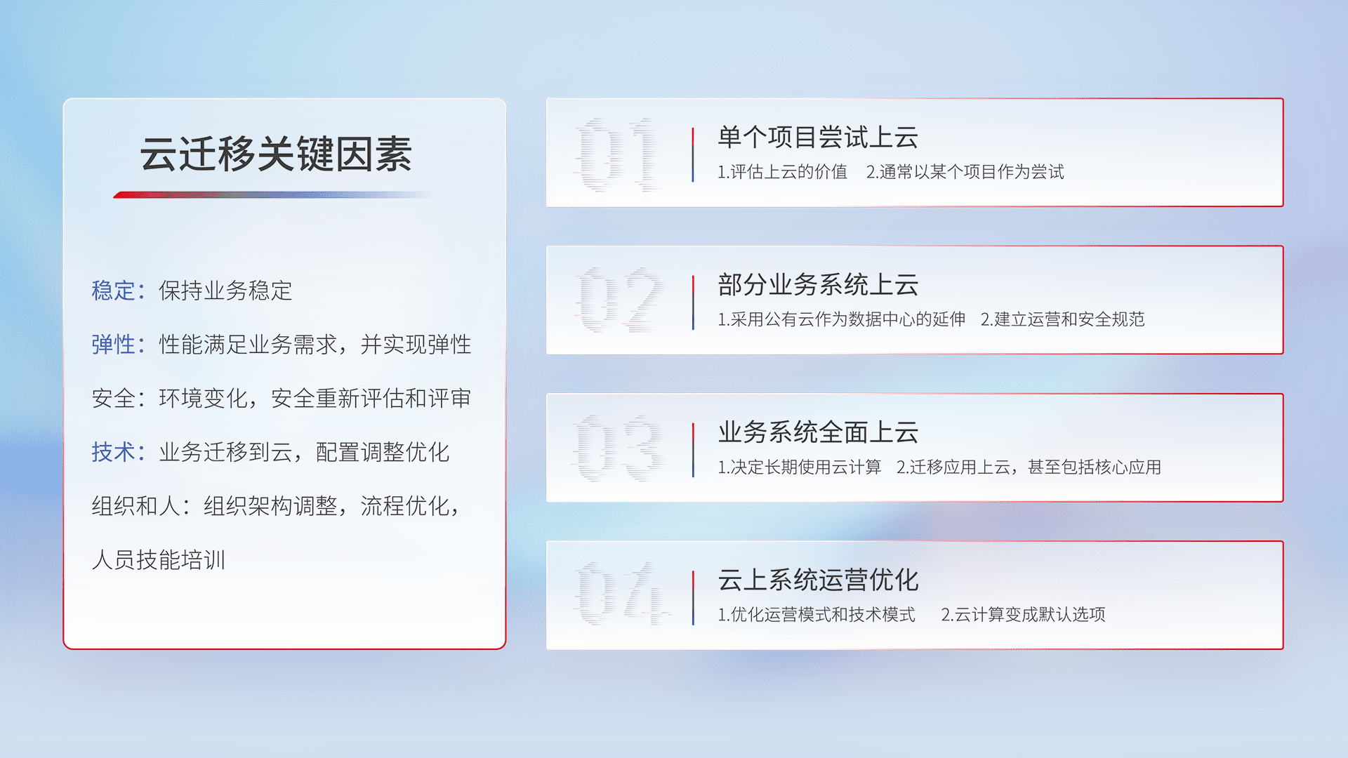结合实际业务,,从规划设计、、云平台选型、、、、云原生改造、、数据迁移、、、集成交付,,,,迁移全过程为客户识别最佳上云路径,,做好风险识别管理,,,,设计网络架构、、、身份权限、、、、安全审计合规、、、、操作审计、、、、日志审计、、监控告警策略、、、多站点容灾设计等,,对云上基础设施进行整体规划,,,提升IT治理水平,,,,以满足弹性、、、、高可用、、高性能的需求。。