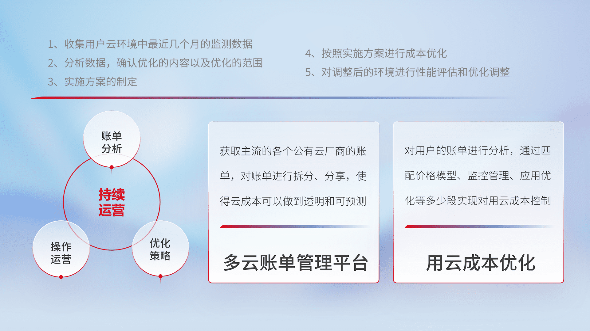 通过多云纳管,,,,以统一的资源数据模型把客户的云资源进行抽象和封装,,,进而实现对多云资源的统一操作,,,,保障云资源管理的可靠性、、稳定性与可用性。。。量身定制化运维内容,,,配置、、、开发运维、、、、补丁管理、、、备份、、、、监控、、认证和访问管理、、审计和日常巡检等,,,保障在用云过程中的可靠度,,,,稳定度以及高可用率。。。