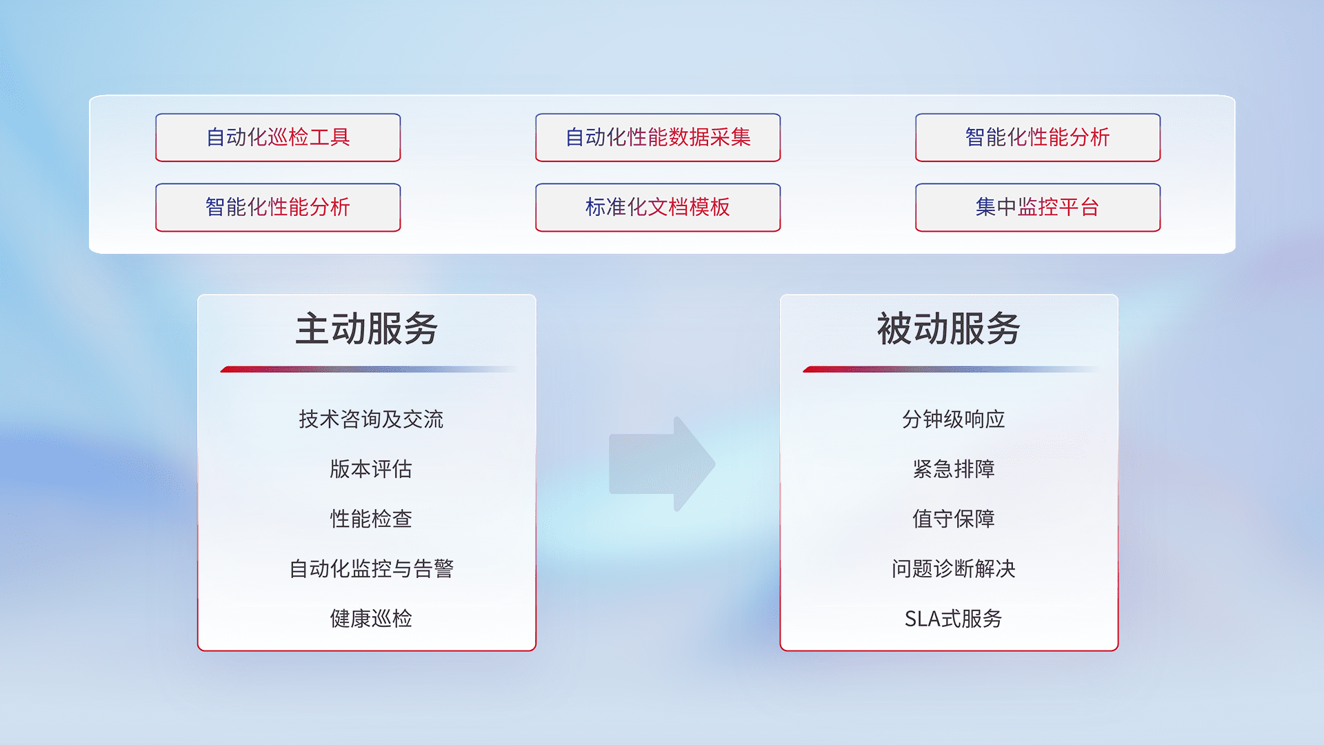 智能化工具和标准化文档,,保障服务质量,,提供主动服务(包含技术咨询、、、、版本评估、、性能检查、、、自动化监控与告警、、、健康巡检)和被动服务包含(分钟级响应、、、、紧急排障、、、、值守保障、、问题诊断解决、、、、SLA服务)。。。